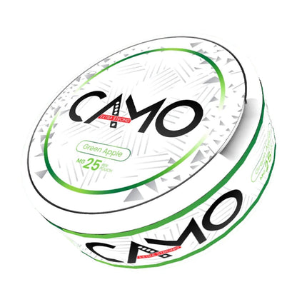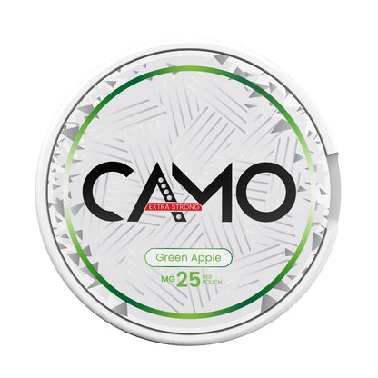 The slim format ensures a comfortable and discreet fit under the lip, while the dry surface and moist interior deliver steady nicotine absorption with minimal drip. With 20 pouches per can, CAMO Green Apple Extra Strong is the ideal companion for anyone seeking energy, flavor, and impact in every portion.