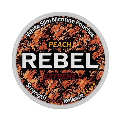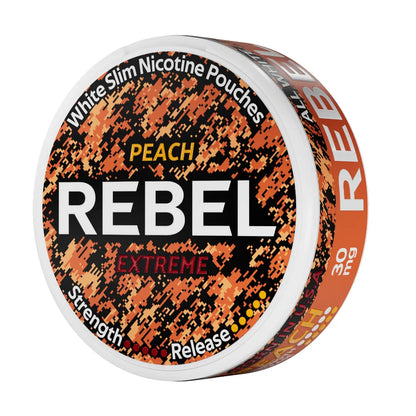 REBEL Peach Extreme nicotine pouches deliver a juicy burst of ripe peach flavor paired with intense strength. With 30 mg/g (18 mg per pouch), this slim, all-white snus is built for experienced users craving both bold fruitiness and a serious nicotine hit.