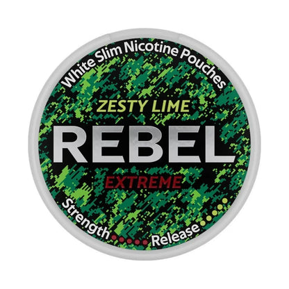 REBEL Zesty Lime Extreme nicotine pouches bring a bold burst of citrus flavor, fusing tangy lime with a refreshing mint finish. With 28.5 mg/g (18 mg per pouch), these slim, tobacco-free snus pouches are made for experienced users looking for strong nicotine satisfaction with a bright, fruity twist.